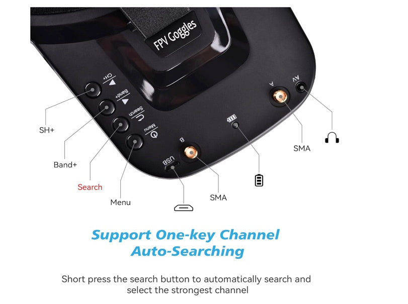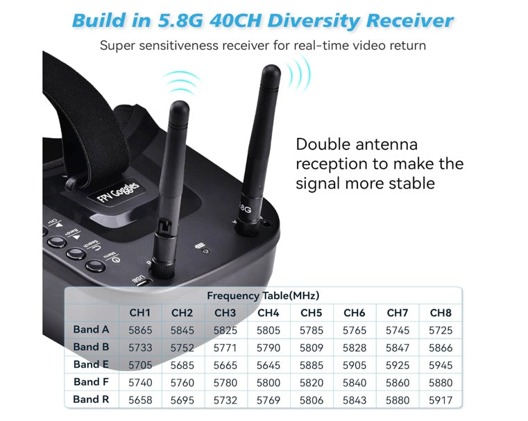 Supports A/B/E/F/R frequency bands with auto-search function, ensuring compatibility with most analog FPV transmitters (VTX) and providing flexible, interference-free operation.