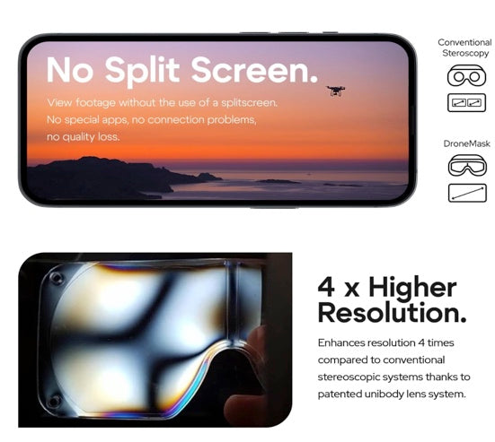 Unlike split-screen VR goggles, DroneMask 2 uses a single-lens optical system that merges the image into one seamless, ultra-clear view — no dizziness, double vision, or distortion.
